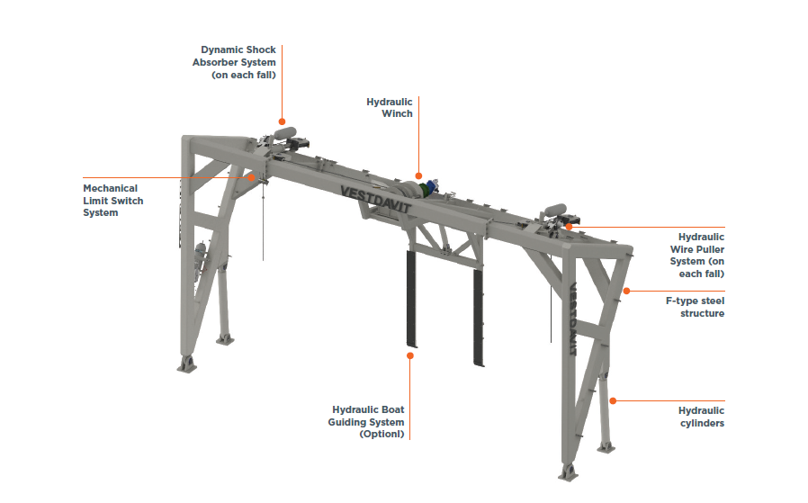 This system is engineered to meet the demanding operational needs of modern maritime environments, ensuring precision, reliability, and safety in both routine and emergency deployment scenarios. This design minimizes stress on the hull and structure of the boat, reducing wear and tear while enhancing the longevity of both the davit system and the vessels it supports. One of the key advantages of the F-Type system is its fully bespoke design, which allows it to be customized based on the Maximum Working Load (MWL) of the operator’s chosen payload. This adaptability ensures that the system seamlessly integrates with a variety of boat sizes, weights, and operational requirements, making it an ideal solution for navies, coast guards, offshore industries, and research vessels that require versatile and dependable launch and recovery capabilities. The F-Type davit is built in full compliance with the latest industry regulations and safety standards, including DNV-GL-498 dimensioning rules and safety coefficients.