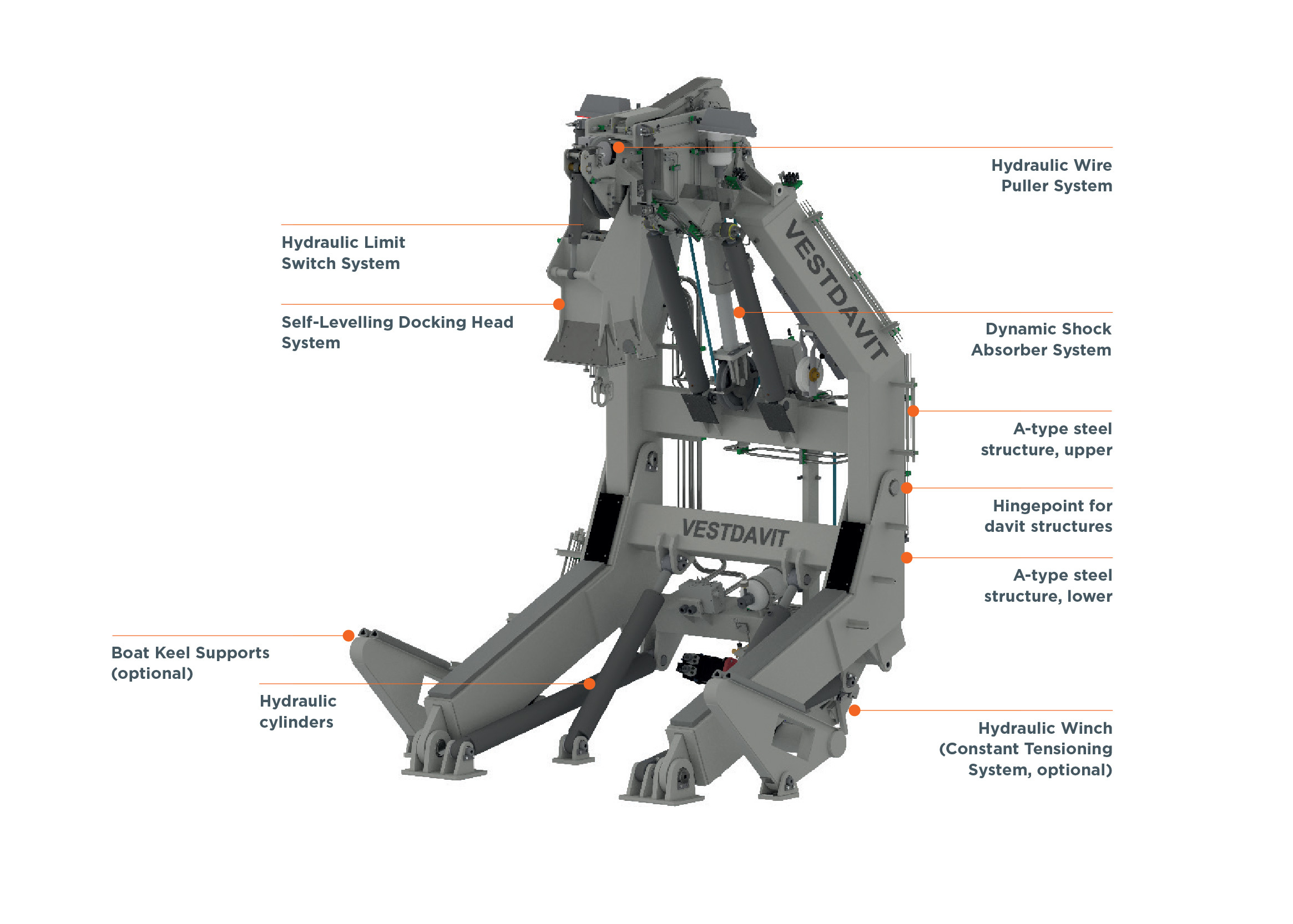 using a single lifting point. These davits are widely used in the naval, offshore, commercial, search and rescue industries, offering reliable and safe deployment solutions even in challenging conditions.