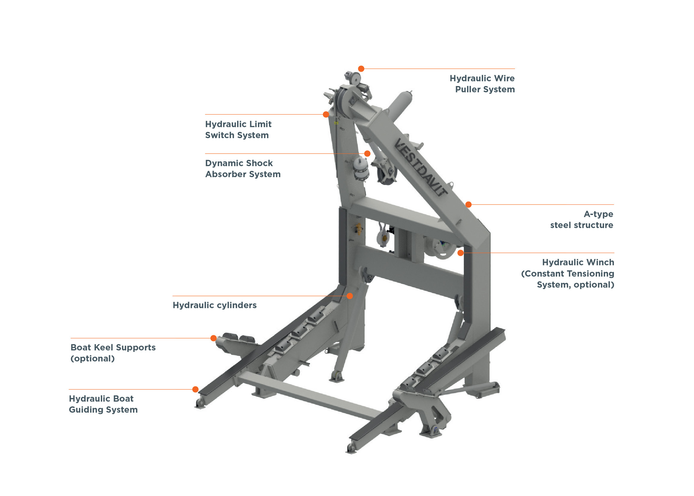 using a single lifting point. These davits are widely used in the naval, offshore, commercial, search and rescue industries, offering reliable and safe deployment solutions even in challenging conditions.
