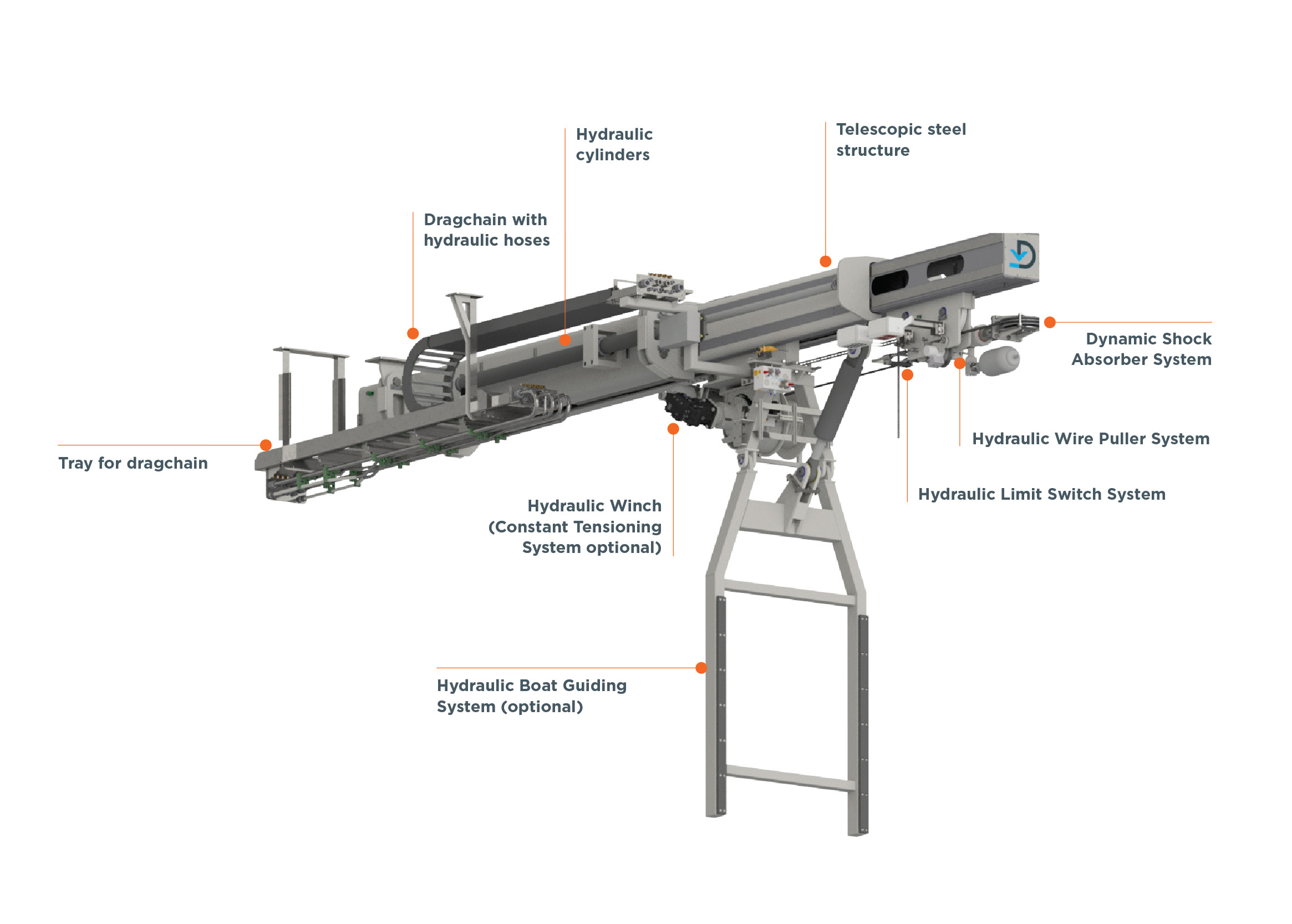A key feature of the Dual TDB Series is its PLC-driven intelligent control system, which enables seamless synchronization between two davits. The PLC ensures precise load balancing, coordinated movement, and automated control, reducing the risk of operational errors and improving overall safety. This level of automation is particularly critical when handling large and delicate payloads, where precision is essential to prevent damage and ensure smooth deployment and retrieval. The system is designed to operate reliably in high-sea states, providing consistent performance in harsh and unpredictable maritime conditions. By minimizing manual intervention, the Dual TDB Series allows for streamlined operations, significantly reducing crew workload and enhancing overall efficiency.